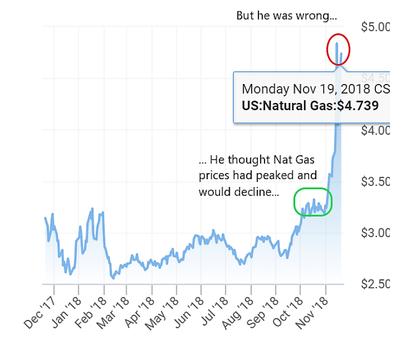 The thesis was that the 2018 winter was expected warmer than previously thought. And with the over-supplies of Nat Gas coming in from higher prices – Nat Gas would weaken over the next few months.