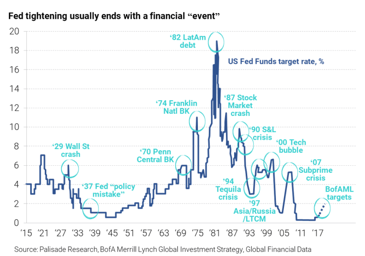 Many forget that most usually every time the Fed has tightened, there’s some sort of financial crisis.