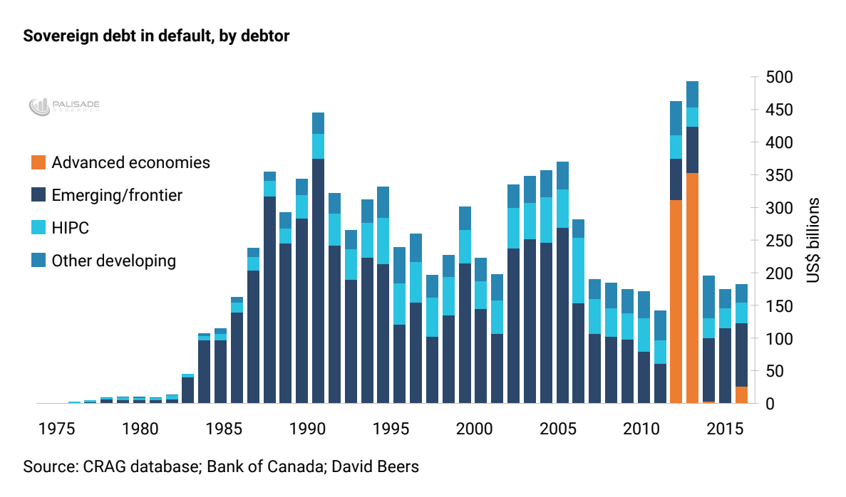 As David Beer’s writes: “A long-held view by some investors is that governments rarely default on local or domestic currency sovereign debt. After all, they say, governments can service these obligations by printing money, which in turn can reduce the real burden of debt through inflation and dramatically so in cases like Germany in the 1923 and Yugoslavia in 1993-94. Of course, it’s true that high inflation can be a form of de facto default on local currency debt. Still, contractual defaults and restructurings occur and are more common than is often supposed.”