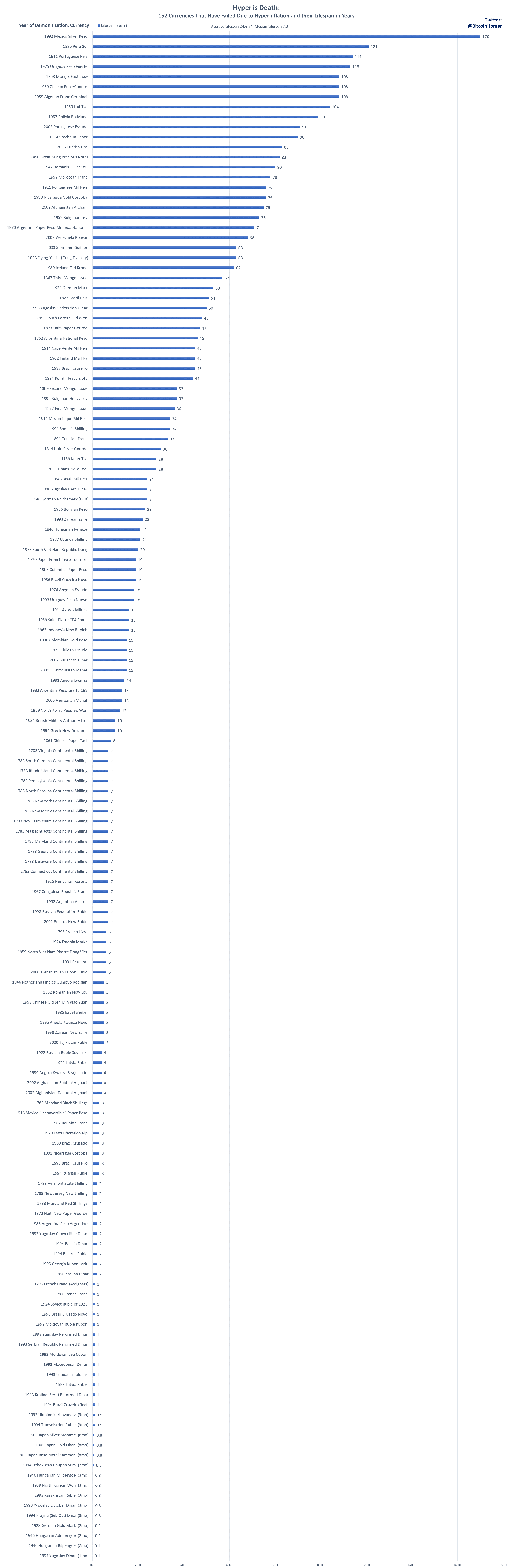 “There are 152 fiat currencies that have failed due to excess inflation. Their average lifespan was 24.6 years and the median lifespan was 7 years. In fact, 82 of these currencies lasted less than a decade. And 15 of them lasted less than 1 year.” - Daniel Lacalle