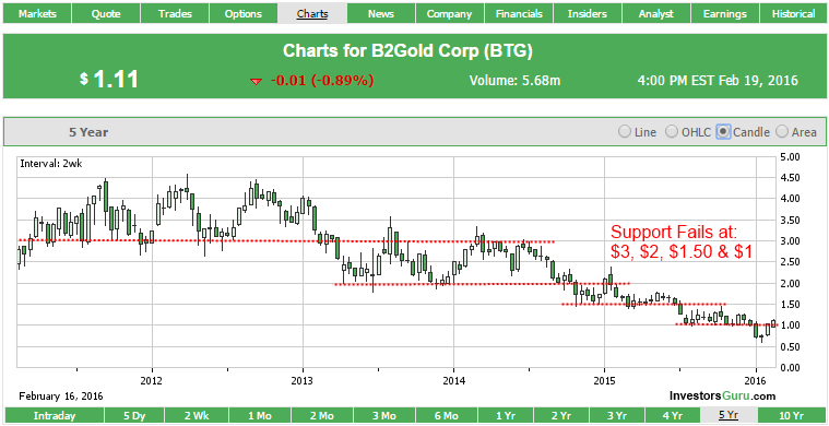 BTG’s charts have also kept me on the sideline as trading continued to test, languish and eventually fail the $3, $2 and $1.50 levels. Last summer’s gold sell-off resulted in BTG touching 5-year lows at $0.98 to then become range bound between $1 and its previous support at $1.50. In my Part II article I mentioned reasons why the dollar support can be especially important to institutions wanting to avoid the stink of holding penny stocks. If this key level finally did fail then I thought BTG could then be cut almost in half, marked down to as low as $0.50 based on the previous two drops.