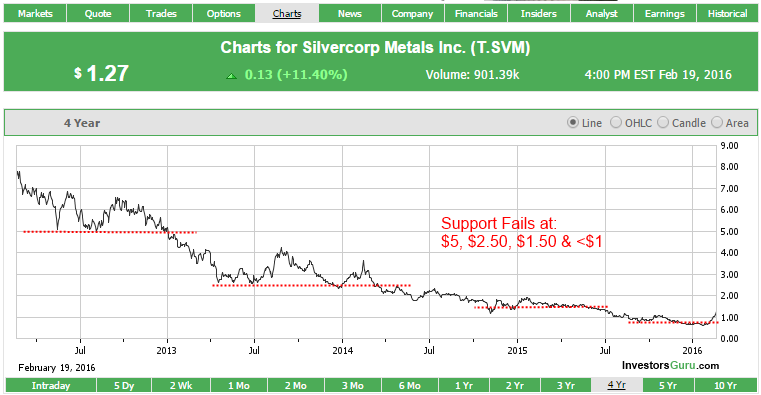 With all mining stocks limbo dancing—how low can you go—since 2011, SVM’s stock charts kept me on the sideline as it continued to fail at C$5, $2.50 and $1.50, to below $1 since last summer. On January 22 SVM made new 10-year lows at C$0.60 and then bounced to $1.38, now $1.27 +112%.