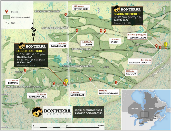I have always liked where (TSXV:BTR)(OTCBB:BONXF) BonTerra Resources’ Properties are located in the prolific Abitibi Gold Belt. I’m sure you have heard the best place to find a mine is next to an existing mine, and BTR’s projects are surrounded by producing and past producing mines. As for Politics, Quebec and Ontario Canada are always ranked top-tier mining friendly safe jurisdictions. Urban-Barry and Windfall Lake are hot area plays with juniors easily raising over $100M recently.