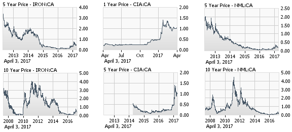 Two to 3-year charts for all three plays, which focus on Quebec and the Labrador Trough, look like a dead person’s EKG until they came back to life suddenly last October. More impressive are the long-term charts which show these stocks traded in 2011 at many times their current share prices as iron ore topped. These development plays are also leveraged optionality bets on higher iron ore prices.
