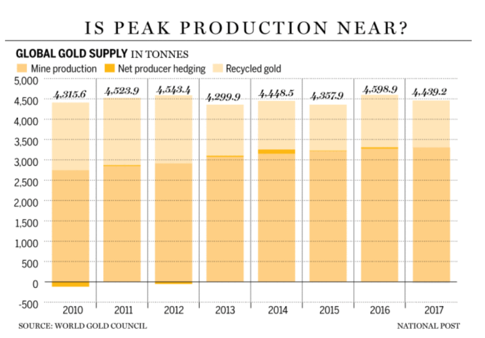 “Gold produced from mines has gone up pretty steadily for 40 years,” Telfer tells the Financial Post. “Well, either this year it starts to go down, or next year it starts to go down, or it’s already going down… We’re right at peak gold here.”