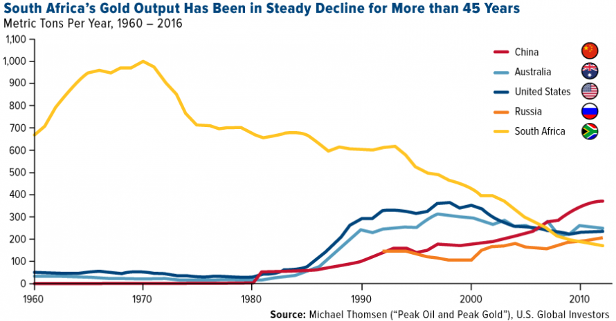 Goldcorp’s Chairman – Ian Telfer – has said the world has now reached this ‘peak gold’ era. This means that global mine production will keep declining because all major gold deposits have already been discovered.
