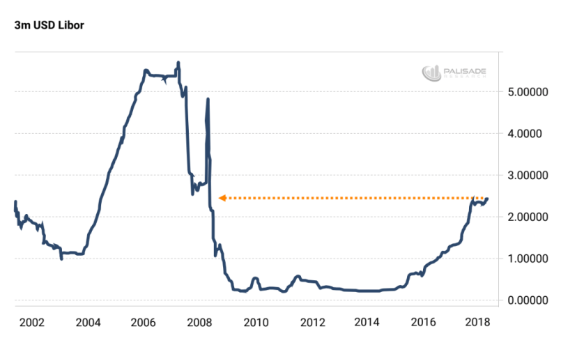 And because of their tightening – the 3-month U.S. dollar LIBOR (London Inter Bank Offered Rate) is at a decade high. Levels not seen since 2008. And expected to continue higher.