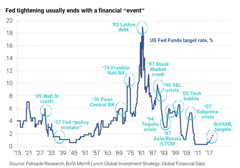 First: as the Fed began tightening after long periods of low rates, it soon ends in some sort of crisis.